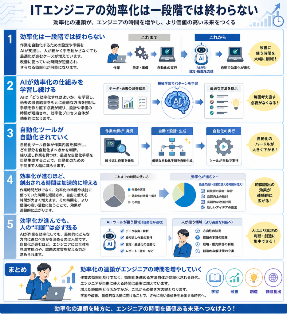 ITエンジニアの世界では、作業の効率化だけでなく、効率化を進める方法自体が効率化されるという大きな変化が起きています。その結果、エンジニアが自由に使える時間は以前より着実に増えています。増えた時間をどう活かすかが今後の働き方の鍵となり、学習や改善、創造的な活動に向けることで、さらに高い価値を生み出せる時代になっています。