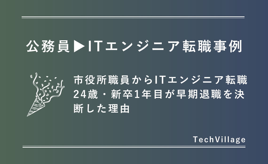 TechVillageを通じて公務員からエンジニア転職に成功した方々に、これまでのご経験、転職理由、何故エンジニアになったのか?TechVillageを活用してよかったポイントなどリアルな声を聞きました。